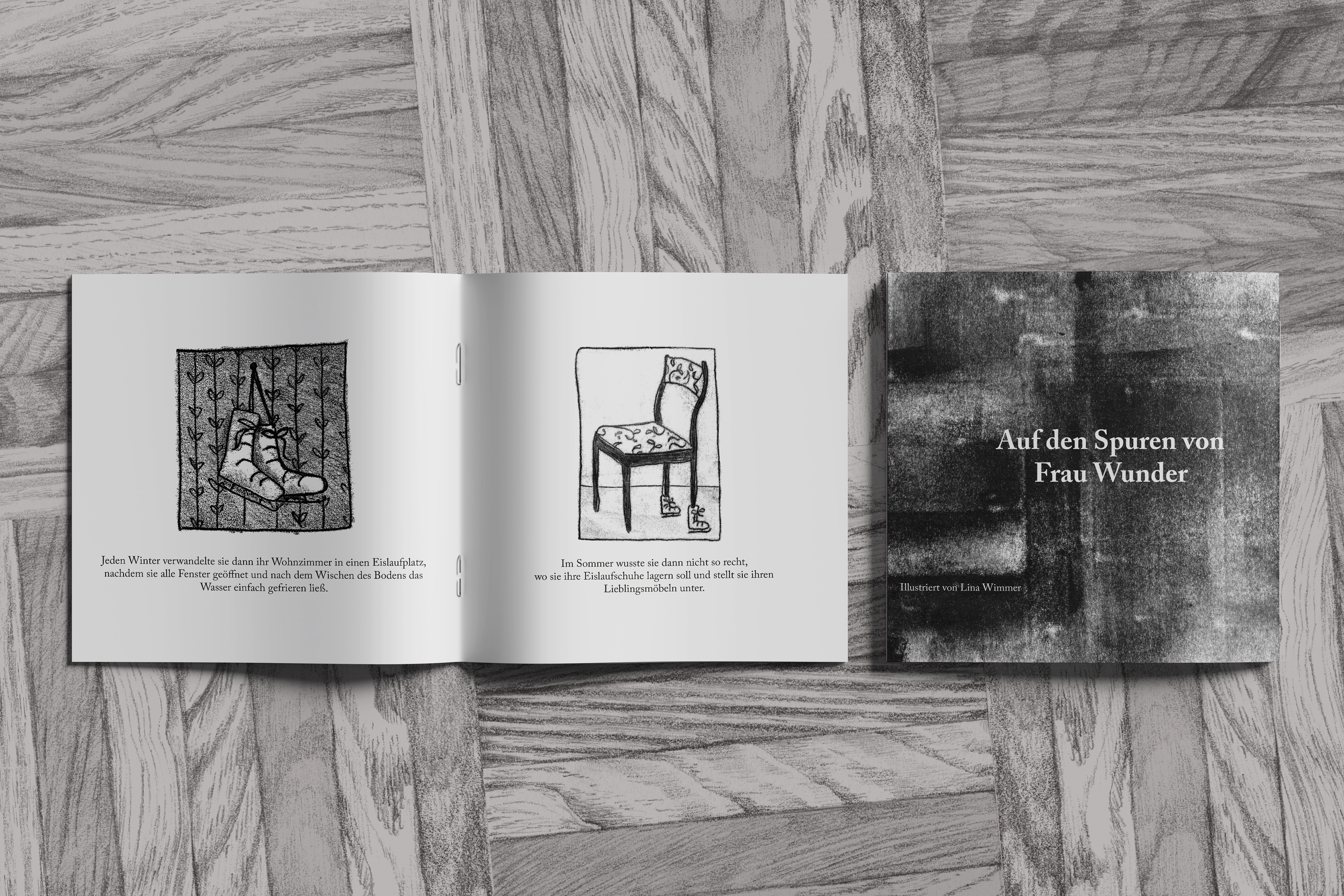 This was a small project in 2020 when the pandemic started. We were all inspired to explore our homes and all the different aspects of being stuck at home. I just moved in a new flat that was not renovated. There was a lot of stuff and signs left from the previous tenant, which made me wonder a lot about this person. Funny enough, this woman's real surname was indeed "Wunder" which translates to wonder. I loved the concept of inventing adventure stories about her, and I made a small booklet.